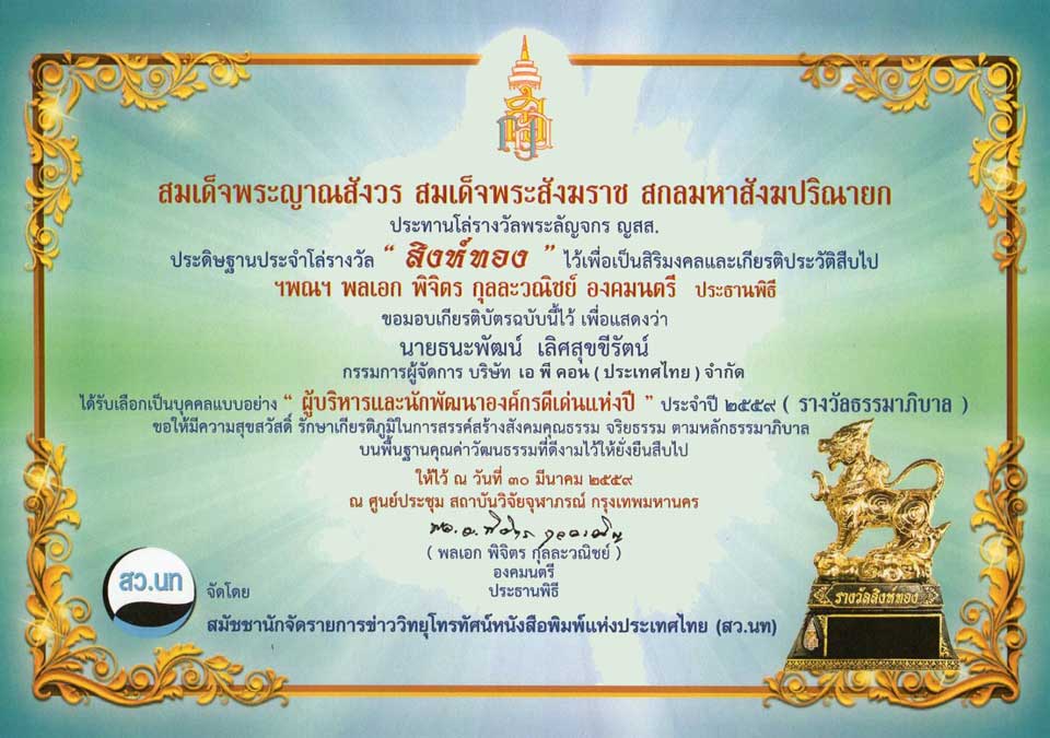 รับเหมาก่อสร้างที่มีธรรมาภิบาล ได้รับรางวัล สิงห์ทอง ผู้บริหาร และนักพัฒนาองค์กร ดีเด่น